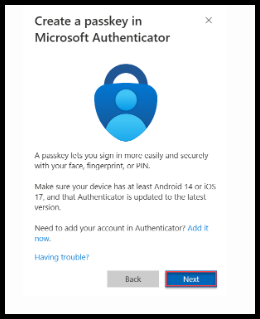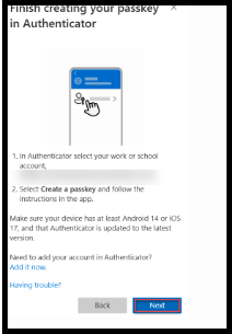 - After the passkey has been added in your Microsoft Authenticator, back on your computer select Next to proceed: