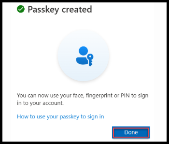 - You will see a confirmation of the passkey being created, select Done to finish: