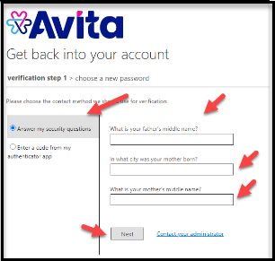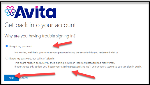 3. Choose Next, you will see the Avita Logo, and you can choose to reset your password: